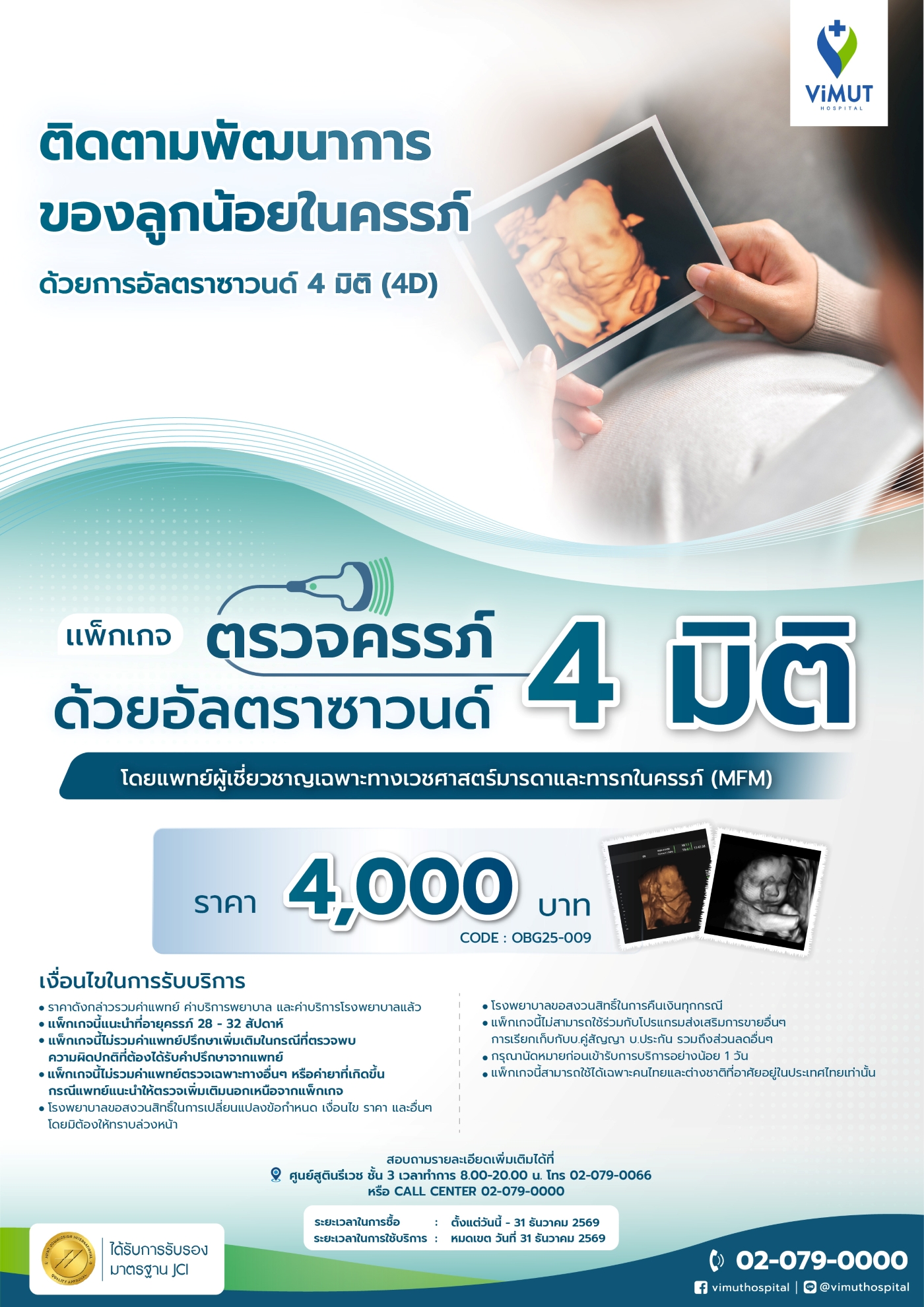 การตรวจครรภ์ด้วยอัลตราซาวนด์ 4 มิติ คือการตรวจอัลตราซาวนด์ที่แสดงภาพ เคลื่อนไหวแบบเรียลไทม์ของทารกในครรภ์ ช่วยให้คุณแม่สามารถ เห็นหน้าลูกน้อย เห็นการขยับ แขน ขา หรือการยิ้มของลูกได้อย่างชัดเจน