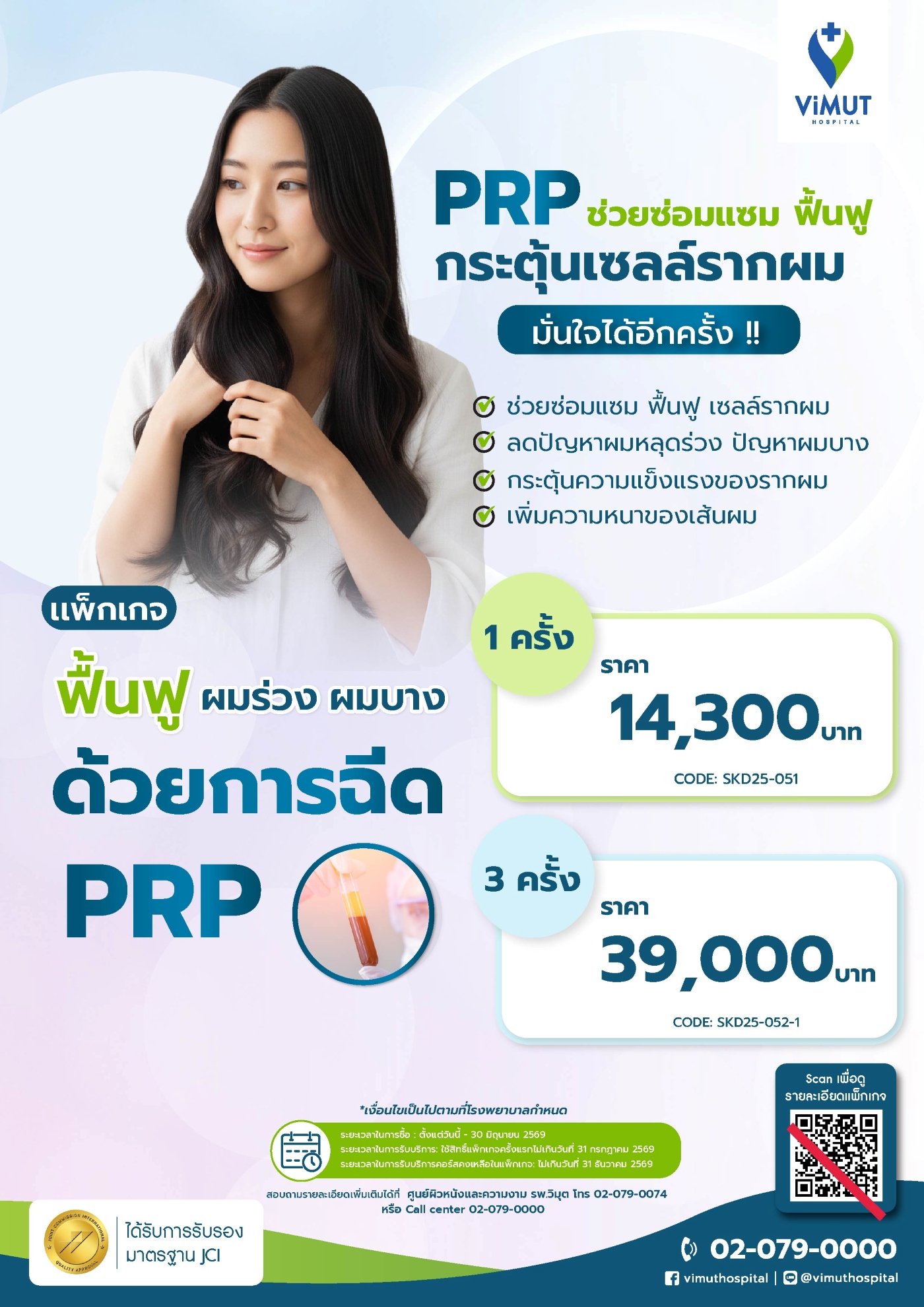 แพ็กเกจฟื้นฟู ผมร่วง ผมบาง ด้วยการฉีดพลาสมาเกล็ดเลือดเข้มข้น (3 ครั้ง)