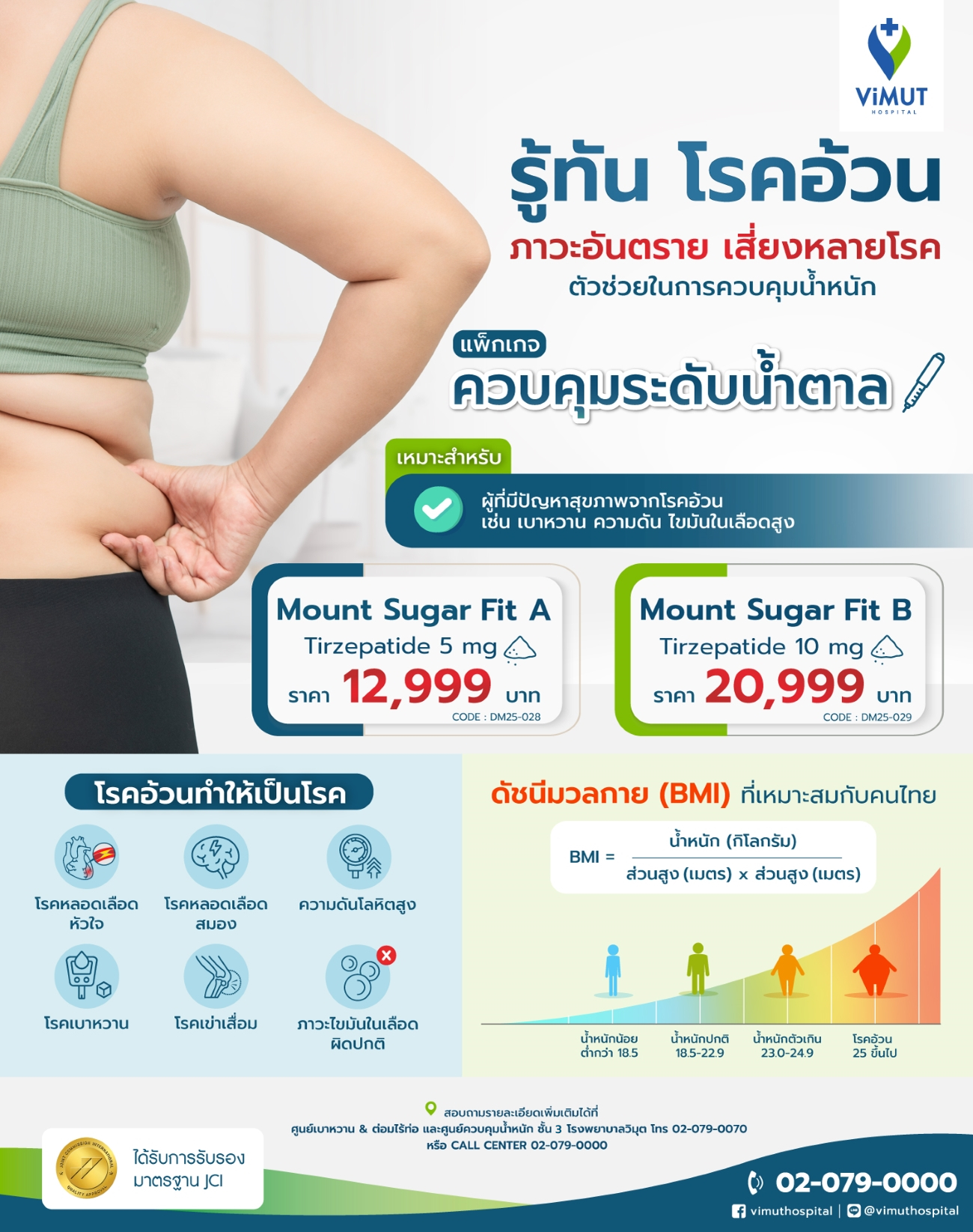 - สอบถามรายละเอียดเพิ่มเติมได้ที่ ศูนย์เบาหวาน & ต่อมไร้ท่อ และศูนย์ควบคุมน้ําหนัก ชั้น 3 โรงพยาบาลวิมุต โทร 02-079-0070 หรือ CALL CENTER 02-079-0000