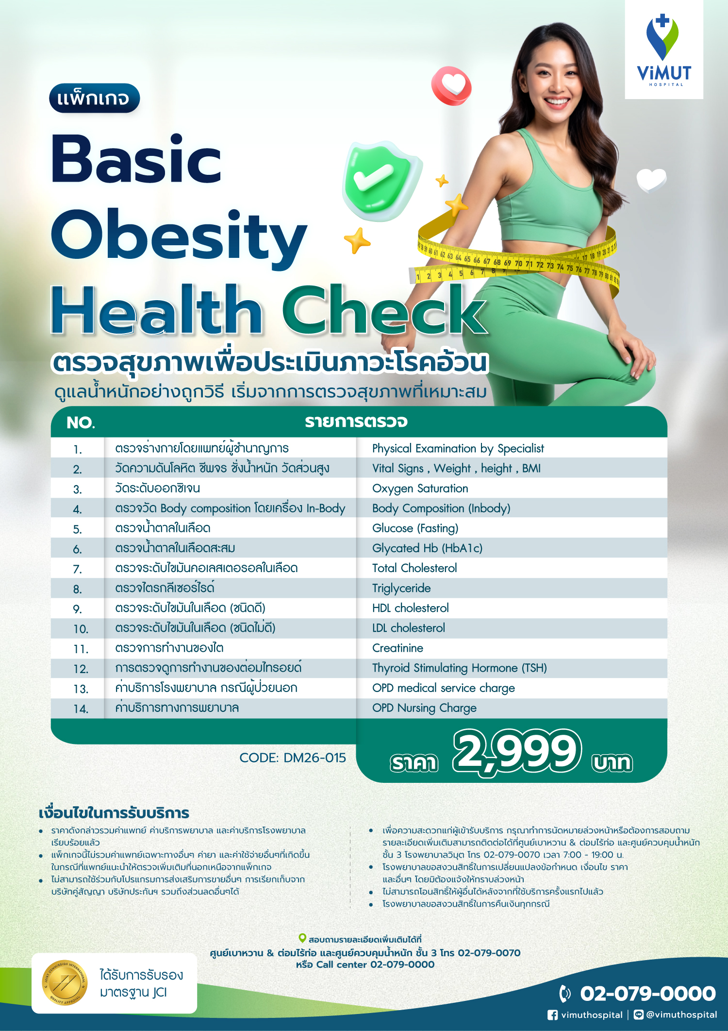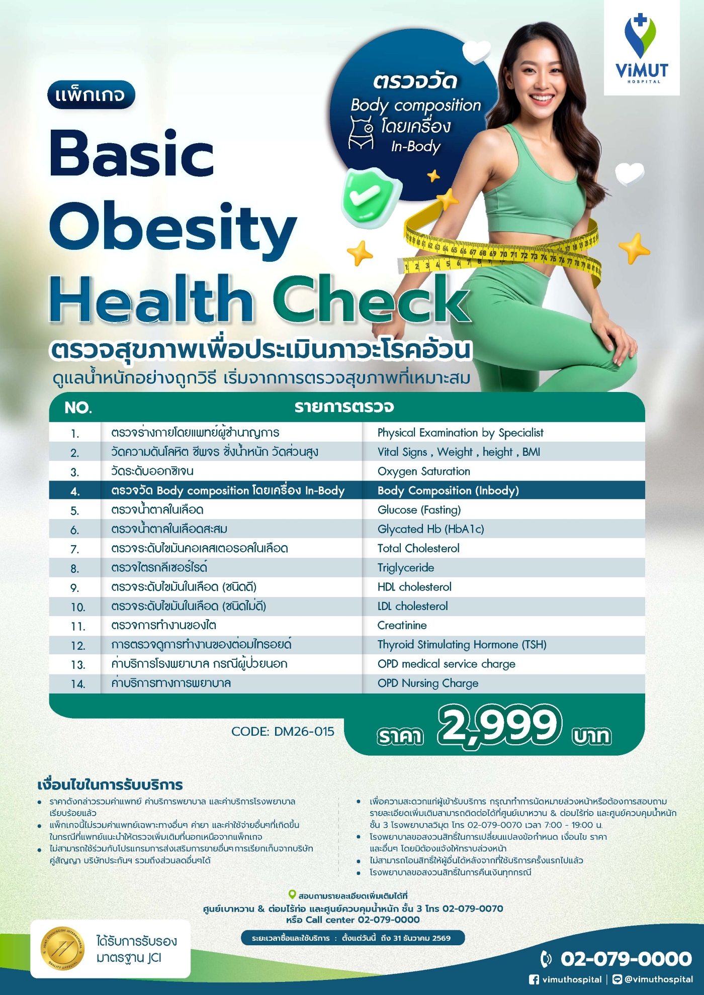 - เพื่อความสะดวกแก่ผู้เข้ารับบริการ กรุณาทำการนัดหมายล่วงหน้า หรือต้องการสอบถามรายละเอียดเพิ่มเติมสามารถติดต่อได้ที่ ศูนย์เบาหวาน & ต่อมไร้ท่อ และศูนย์ควบคุมน้ำหนัก ชั้น 3 โรงพยาบาลวิมุต โทร 02-079-0070 เวลา 7:00 – 19:00 น.