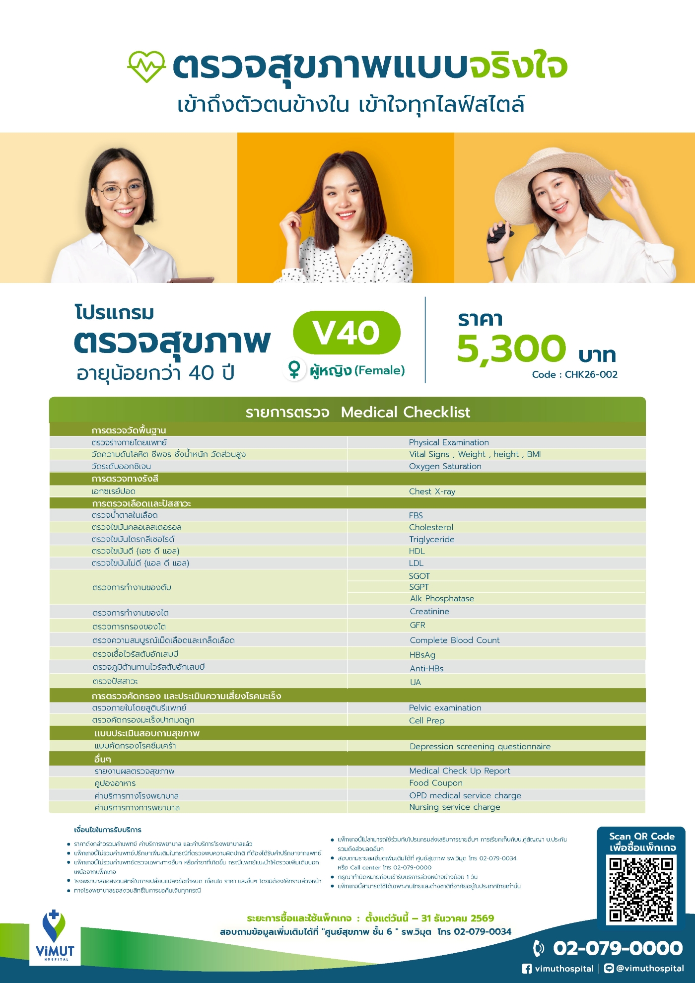 - โปรแกรมตรวจสุขภาพผู้หญิง V40 Female จากโรงพยาบาลวิมุต ครอบคลุมและครบครัน ที่ออกแบบมาแล้วเพื่อผู้หญิงในวัยนี้โดยเฉพาะ