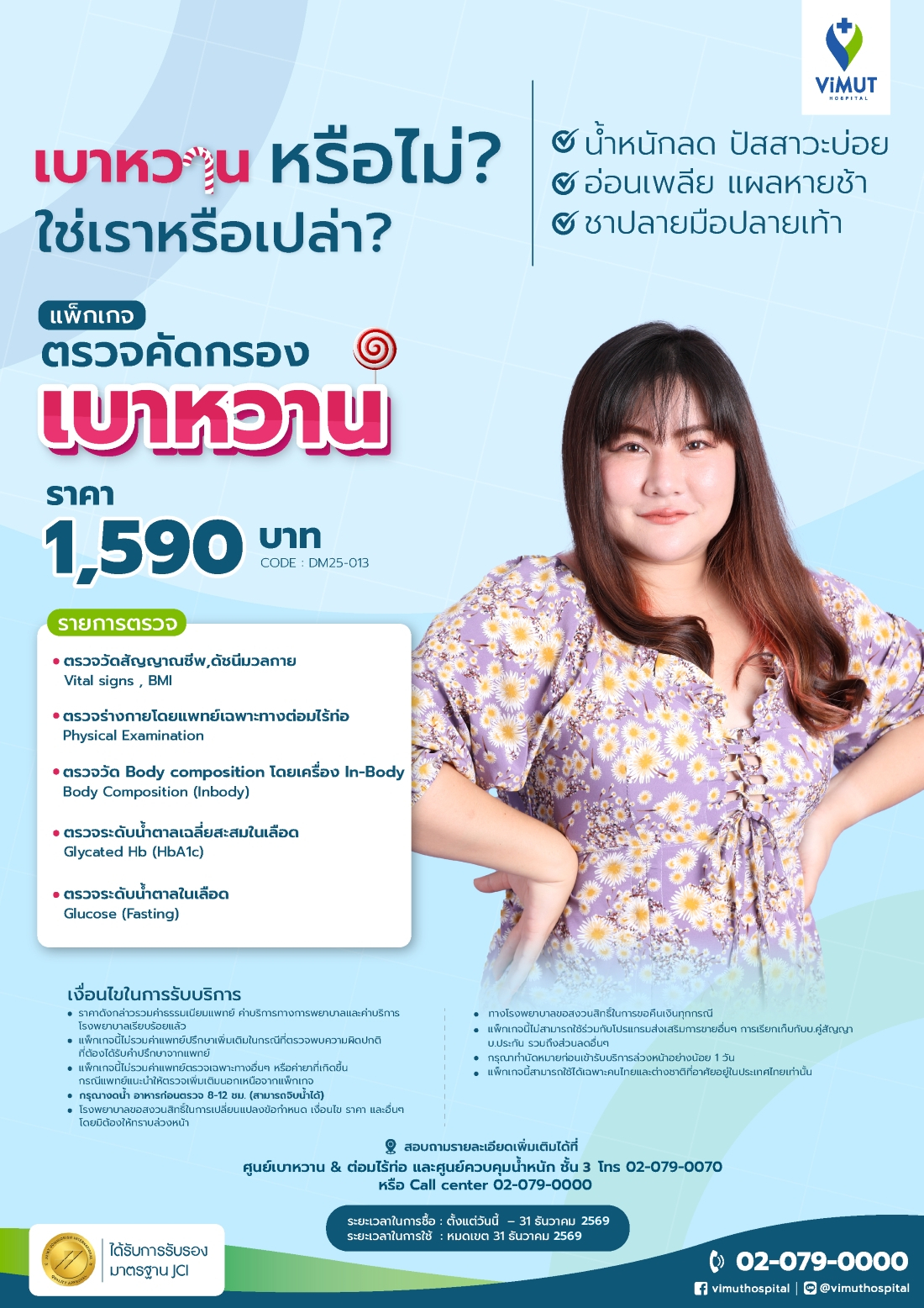 - เพื่อความสะดวกแก่ผู้เข้ารับบริการ กรุณาทำการนัดหมายล่วงหน้าได้ที่ ศูนย์เบาหวาน ไทรอยด์ ต่อมไร้ท่อ และควบคุมน้ำหนัก ชั้น 3 โรงพยาบาลวิมุต โทร 02-079-0070