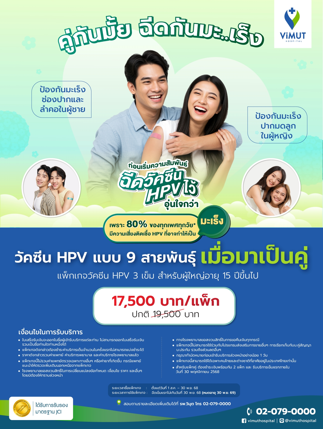 - แพ็กเกจโปรแกรมฉีดวัคซีนป้องกันมะเร็งปากมดลูก HPV 9 สายพันธุ์ 3 เข็ม สามารถใช้ได้เฉพาะที่โรงพยาบาลวิมุต พหลโยธิน เท่านั้น